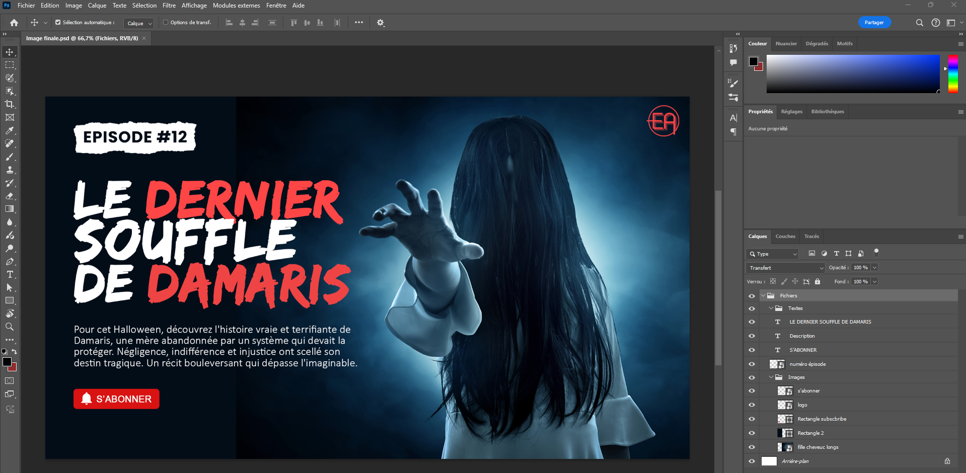 Conception de l’identité visuelle du podcast sous Adobe Photoshop, à partir d’une réflexion éditoriale et narrative. Le visuel a été pensé pour traduire l’univers sonore et émotionnel de l’épisode, installer une ambiance immersive et renforcer la cohérence globale du projet.
