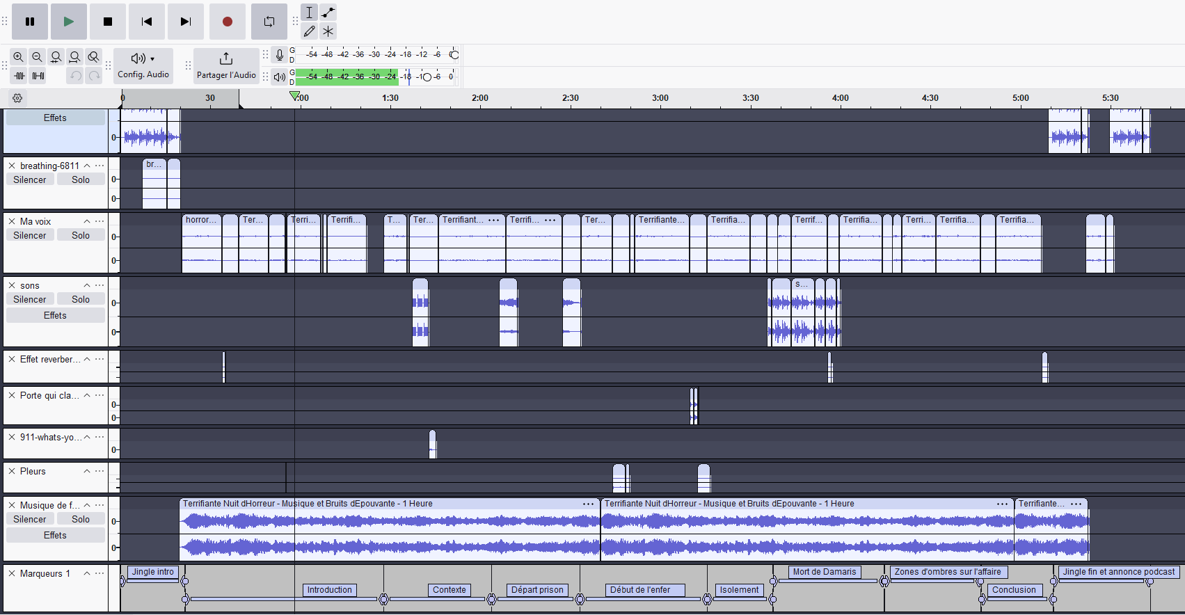 La réalisation du podcast repose sur l’utilisation du logiciel Audacity pour l’ensemble du montage audio, ainsi que sur l’intégration de sons et musiques libres de droit issus de la plateforme Pixabay, afin de construire une ambiance immersive et maîtrisée.